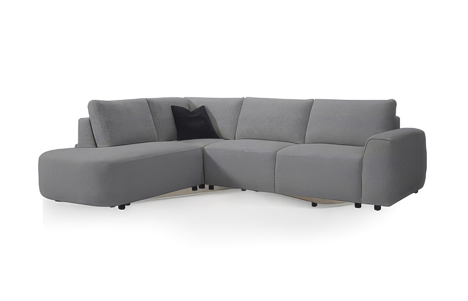 A contemporary L-shaped, left-facing sectional designed with soft, gently curved lines for a welcoming, modern look. Upholstered in grey fabric, it blends comfort with style, creating an inviting space for lounging or entertaining. The flowing curves add a subtle elegance while maintaining a relaxed, approachable feel, making it a versatile centerpiece for any living room.