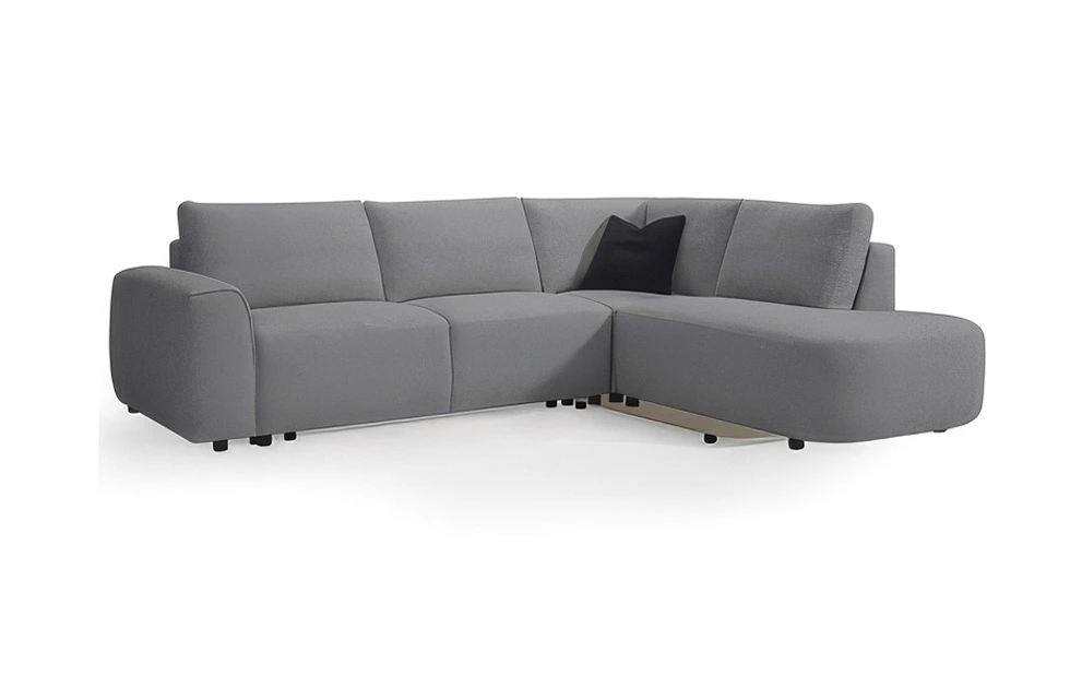 A contemporary L-shaped, right-facing sectional designed with soft, gently curved lines for a welcoming, modern look. Upholstered in grey fabric, it blends comfort with style, creating an inviting space for lounging or entertaining. The flowing curves add a subtle elegance while maintaining a relaxed, approachable feel, making it a versatile centerpiece for any living room.